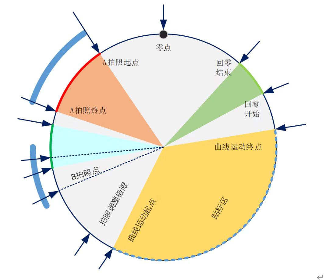 如圖4為標(biāo)簽的收放卷機(jī)構(gòu),其放卷必須確保與大盤同步,并能夠進(jìn)行補(bǔ)充調(diào)整,而收卷則采用扭矩控制模式,帶擺輥的方式。通常送標(biāo)帶色標(biāo)的方式,送標(biāo)控制由電子凸輪控制及鎖標(biāo)(LATCH)功能配合完成,確保能夠精準(zhǔn)而又平穩(wěn)的送標(biāo)過程。在這個(gè)過程中,必須對色標(biāo)、主軸編碼器信號進(jìn)行微秒級的預(yù)測和延時(shí)處理,以確保高速中的信號實(shí)時(shí)同步。