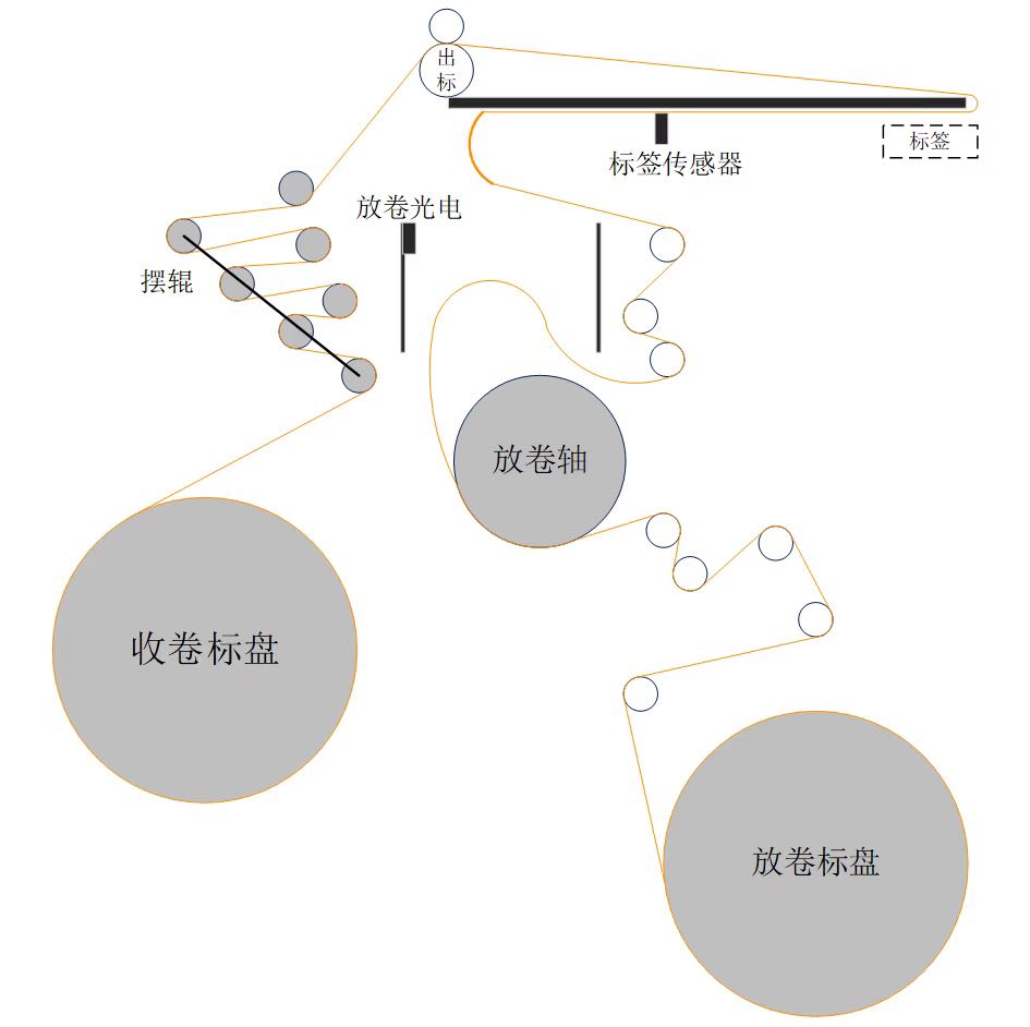 圖4是送標(biāo)機(jī)構(gòu)的示意圖,它是將標(biāo)簽放卷、牽引、送出、裁切的機(jī)構(gòu)構(gòu)成,可以由多種類型的標(biāo)站,采用收放卷的高速運(yùn)動(dòng)控制技術(shù)來保障穩(wěn)定的張力,以為精準(zhǔn)送標(biāo)、切標(biāo)提供保障。