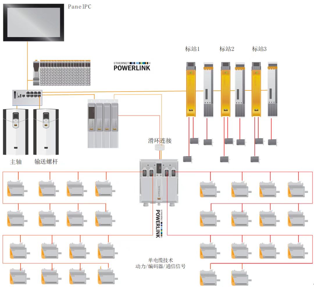 從圖5整個(gè)機(jī)器的配置可以看到,多達(dá)36個(gè)伺服電機(jī),其高速同步性,由POWERLINK實(shí)時(shí)網(wǎng)絡(luò)來保障,達(dá)到百微秒級的任務(wù)周期。而另一方面采用ACOPOSmotor伺服驅(qū)動(dòng)與電機(jī)一體的設(shè)計(jì),也讓整個(gè)接線變得更少,且空間緊湊,易于機(jī)械的安裝維護(hù)。